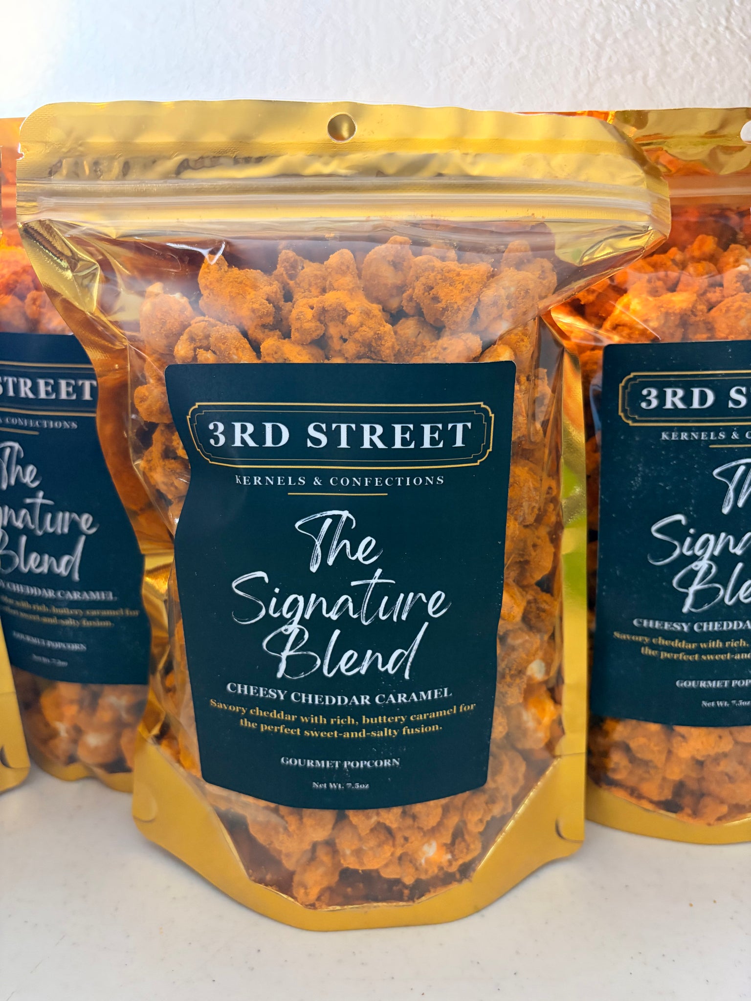 The Signature Blend (Cheesy Cheddar Caramel) is a delicious and indulgent snack that combines the savory goodness of cheddar cheese with the rich, sweet and buttery homemade caramel. The combination of these two contrasting flavors makes for a unique and mouthwatering popcorn experience, perfect for satisfying both sweet and savory cravings in one delightful bite.